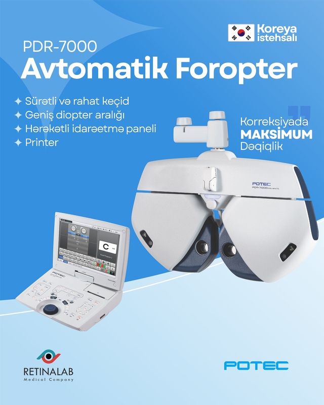 Bu avtomatik foropter sürətli keçid və geniş diopter aralığı ilə gözləriniz üçün ən uyğun optik korreksiyanı təyin edir. Cihaz, 1992-ci ildə Koreyada qurulmuş və bu sahədə qabaqcıl şirkətlərdən biri olan © POTEC tərəfindən hazırlanmışdır. PDR-7000 modeli 10.4 düymlük sensor ekranlı və hərəkətli idarəetmə paneli ilə təchiz olunub.