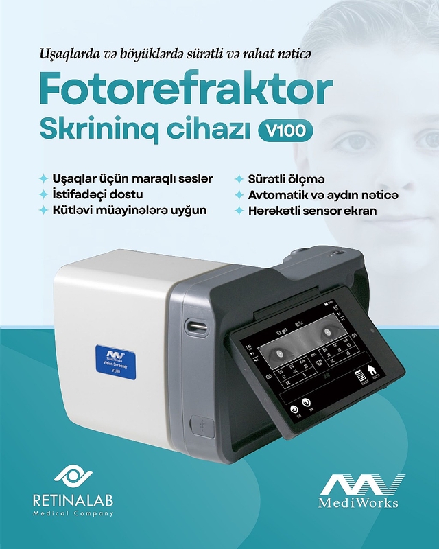 Fotorefraktor , avtomatik skrininq funksiyaları ilə yüksək sürət və dəqiqlik təmin edir. Uşaqlara maraqlı səslərlə uyğunlaşan və portativ sensor ekranlı bu cihazla müayinələri daha asan və rahat həyata keçirmək mümkündür. Avtomatik ölçmə, istifadəçi dostu interfeys və bunun kimi müxtəlif funksiyalar ilə nəticələr daha sürətli və dəqiq bir şəkildə əldə edilir.