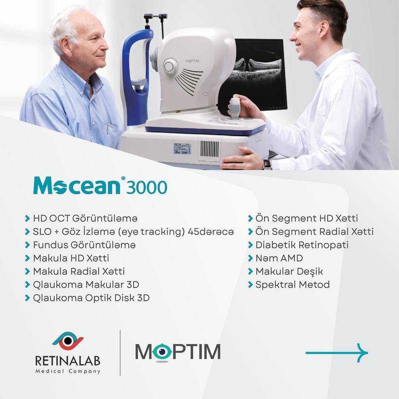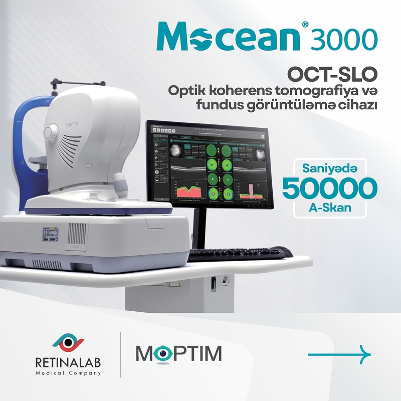 Mocean 3000®️, qabaqcıl SLO-OCT texnologiyası ilə təchiz edilmiş bir optik koherens tomoqrafiya cihazıdır və geniş çeşidli göz xəstəliklərinin diaqnostikasında istifadə olunur. SLO texnologiyasına əsaslanan geniş diapazonlu real-vaxt fundus görüntüləmə xüsusiyyəti ilə retina üzərində dəqiq təsvirlər təqdim edir və xəstəlik ocaqlarını asanlıqla aşkar etməyə imkan verir. Cihazın göz hərəkətlərinə qarşı artifaktları azaltmaq üçün saniyədə 100 dəfə və 10 mikron dəqiqliklə izləmə funksiyası mövcuddur ki, bu da praktikada daha dəqiq nəticələr verir.