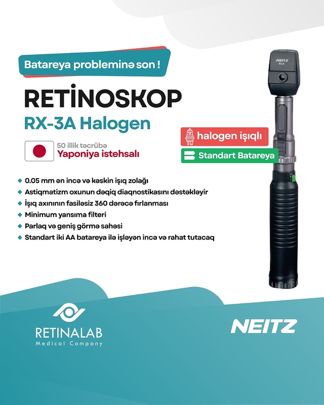 Neitz şirkətinin BXα-13A halogen oftalmoskopu, göz dibi müayinələri üçün nəzərdə tutulmuş batareya ilə işləyən tibbi cihazdır. BXα-13A modeli, istifadəsi rahat və portativ dizaynı sayəsində oftalmoloji müayinələrdə etibarlı və effektiv bir alət kimi tanınır.