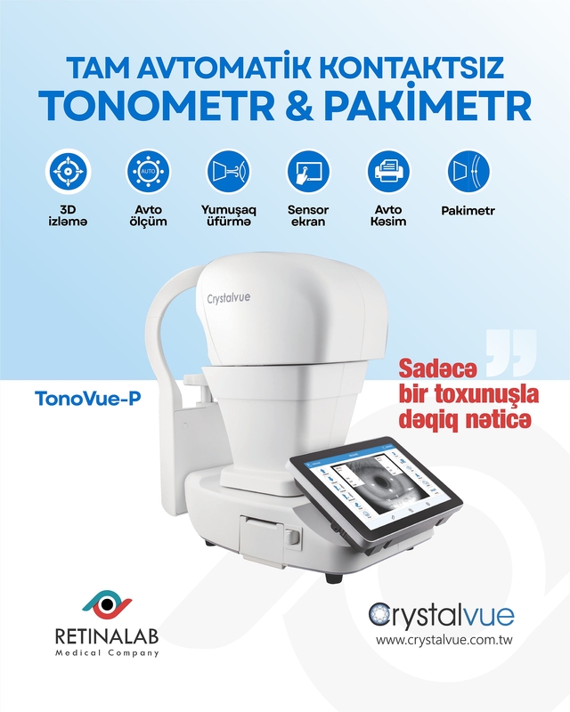 TonoVue-P, tam avtomatik və kontaktsız işləmə prinsipi ilə təchiz olunmuş tonometr və pakimetr cihazıdır. Göz daxili təzyiq (IOP) və mərkəzi buynuz qişa qalınlığının (CCT) ölçülməsi üçün nəzərdə tutulmuş bu cihaz, 3D avtomatik izləmə texnologiyası və yumşaq hava üfürməsi sayəsində həm pasiyentlər, həm də həkimlər üçün rahat və dəqiq müayinə təmin edir.Sensor ekran üzərindən tək toxunuşla müayinəni başlatmaq, nəticələrin həm ekranda göstərilməsi, həm də avtomatik çapı prosesi daha da sürətləndirir və sadələşdirir.